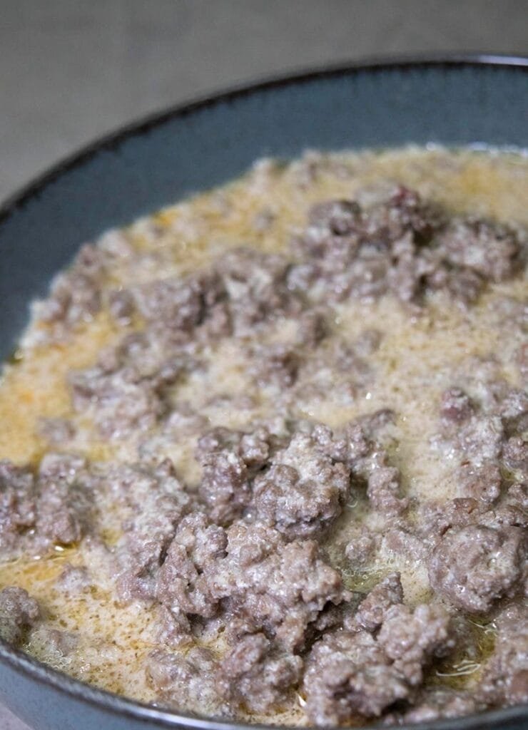 Reduce heat to medium-low. Stir in the cream cheese and let it melt into the beef. Then slowly pour in the heavy cream while stirring. - Add Broth (Optional):