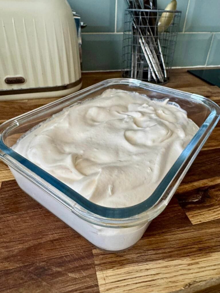 - Whip the cream: In another bowl, beat the double cream until it forms soft peaks.