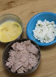 The egg and cheese will help bind the tuna and form a dough-like consistency. If the mixture feels too wet, you can add a bit more Parmesan or cheese to help it firm up.