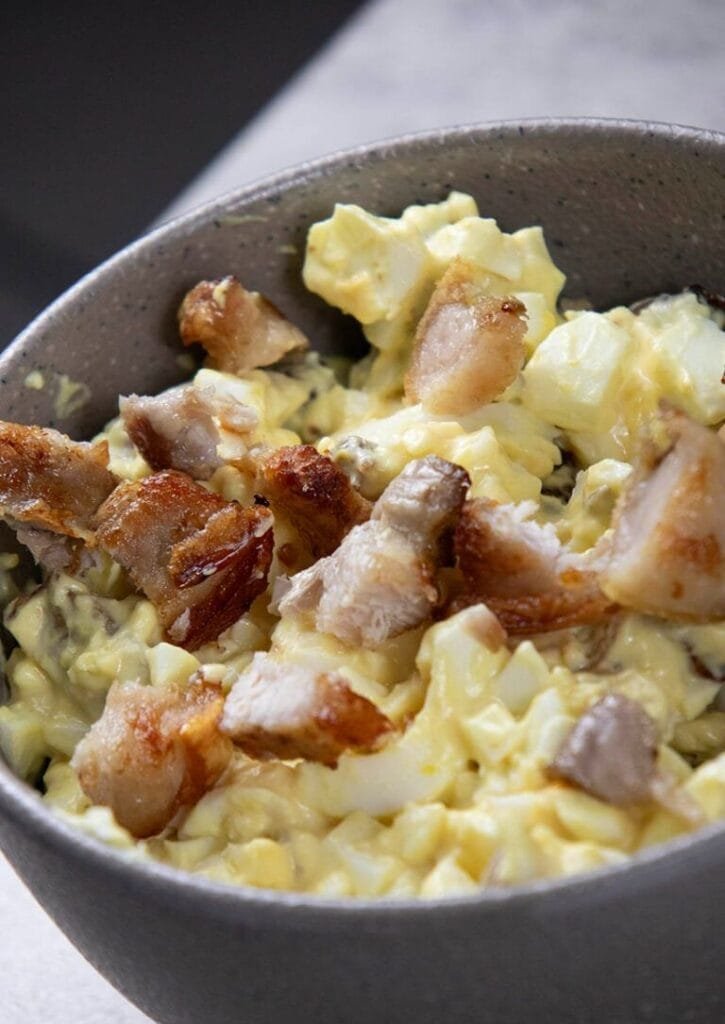 - Serve the Carnivore Creamy Egg Salad Dip in a bowl, garnished with fresh herbs like parsley or chives (optional).