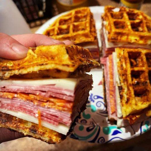- Slice your sandwich in half, and you’re ready to enjoy this savory, meaty chaffle sandwich!