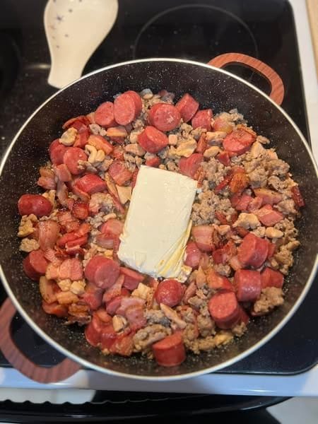 - Once all the meats are cooked, pour in the 2 cups of water and 1 quart of heavy cream. Stir to combine and bring the mixture to a gentle simmer. Let it cook for 10-15 minutes, allowing the flavors to meld together.