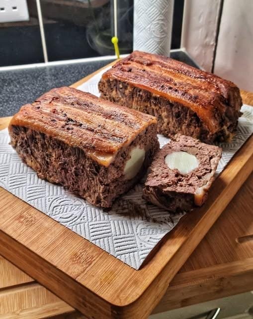 Top with pork belly strips: Lay the thinly sliced strips of pork belly across the top of the meatloaf. The pork belly will crisp up beautifully in the oven and add an extra layer of flavor.