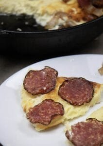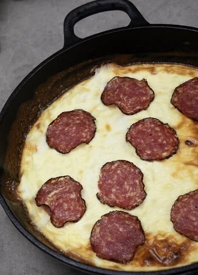 - Slice and enjoy your Carnivore Skillet Pizza!