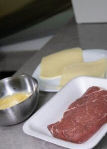 - Place the sliced steak pieces in the center of the cooked egg wrap.