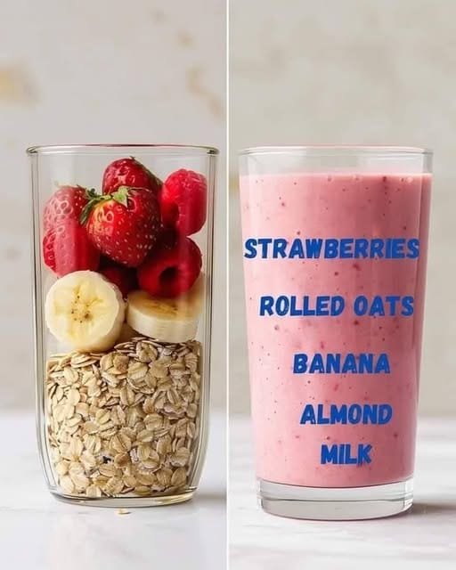 Strawberry Oatmeal Breakfast Smoothie! 🍓🌾🍌 Ingredients: 1 cup fresh or frozen strawberries 🍓 1/2 cup rolled oats 🌾 1 banana