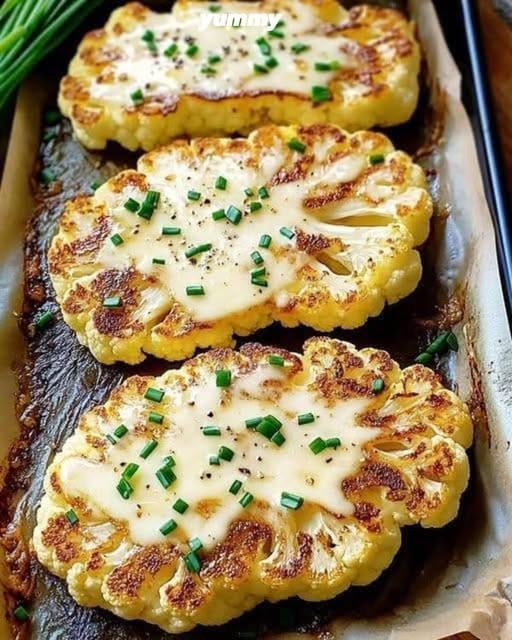 This Cheesy Cauliflower Steaks recipe transforms humble cauliflower into a golden, savory, and hearty dish. Thick cauliflower “steaks” are roasted until tender and caramelized, then topped with a luscious blend of Parmesan and Gruyère. Finished with fresh chives, it’s a dish that balances comfort with sophistication—ideal as a vegetarian main or a stunning side.