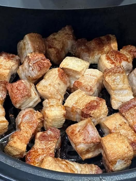 Boil pieces in water with salt for 10–15 minutes. This renders some fat and makes the skin blister more when fried.