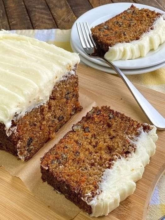 Moist and light carrot cake, baked into a loaf and topped with a generous amount of cream cheese frosting.