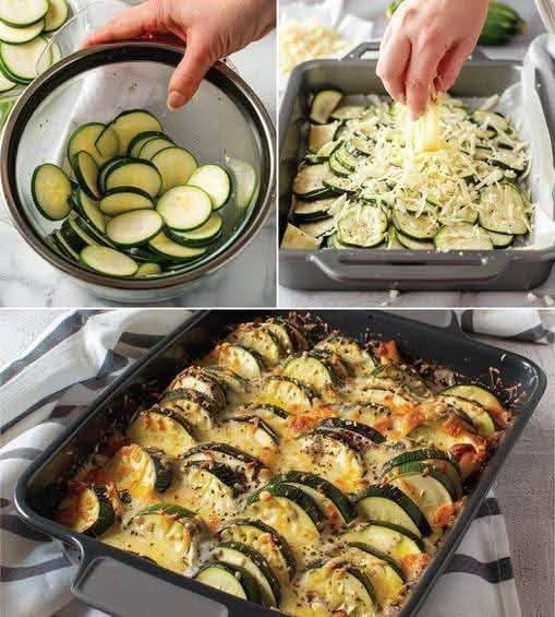 - Layer zucchini in a baking dish.