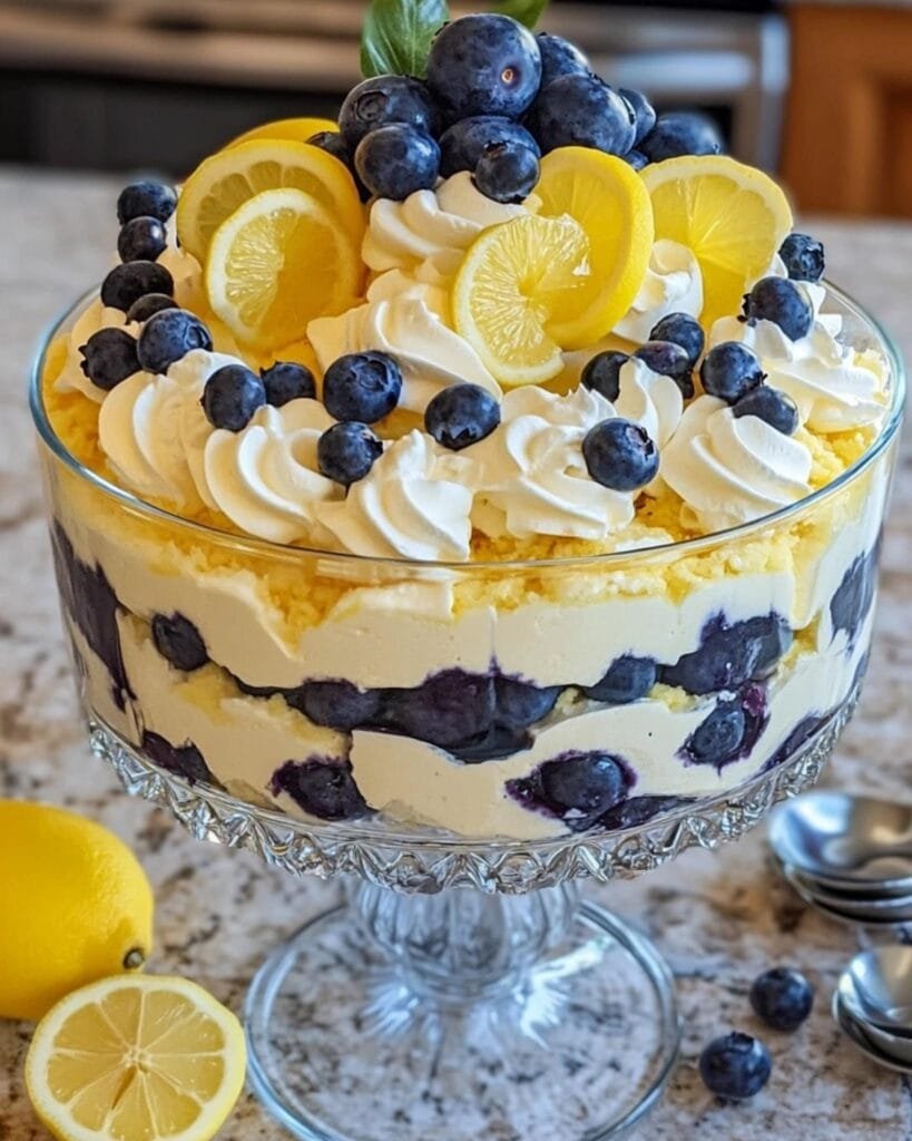 🍋 🍽️ This refreshing, layered trifle combines zesty lemon, rich cheesecake filling, and juicy blueberries. Perfect for any occasion!