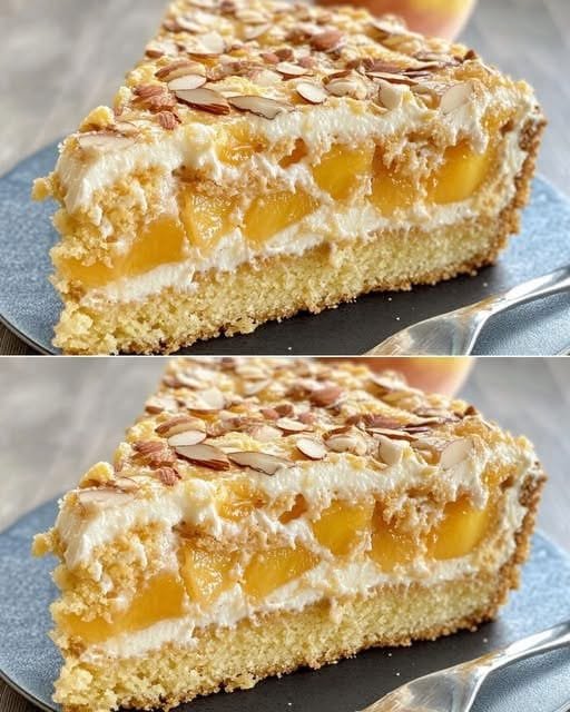 Elegant New Year’s Peach and Cream Layer Cake with Almond Topping