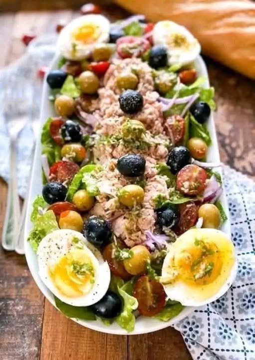 Drain the can of tuna into a sieve, give the tuna a quick mix and add over salad, along with the green & black olives and hard boiled eggs cut in half vertically, season with sea salt & black pepper and pour the dressing over the salad, serve at once, enjoy!