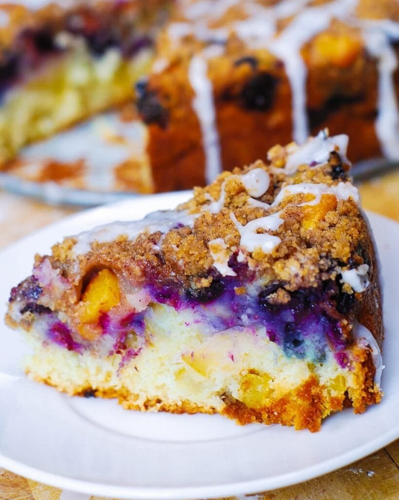 A moist, buttery cake loaded with apples, blueberries, and peaches, topped with a crumbly cinnamon brown sugar streusel and finished with a light vanilla glaze!