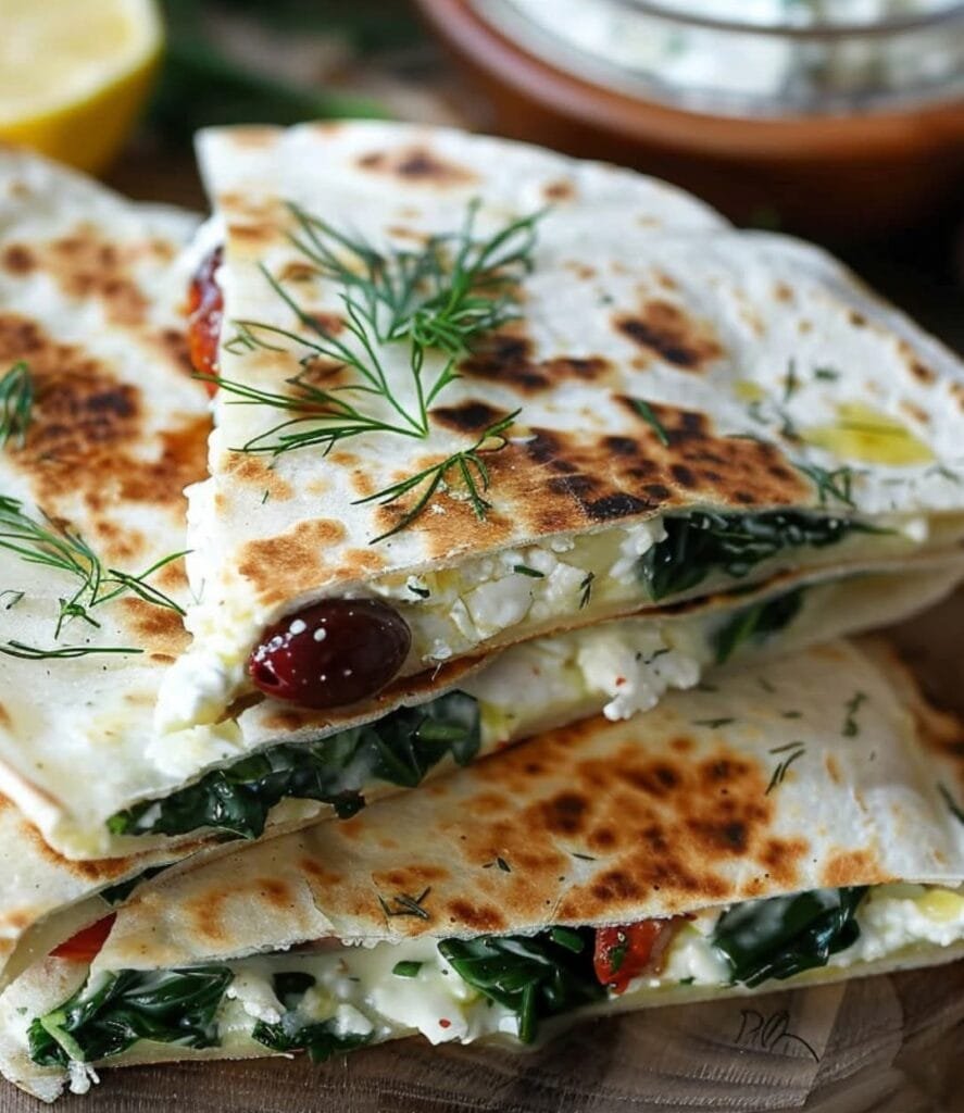 Greek Quesadillas are a fusion of classic Mexican and Mediterranean flavors, offering a unique twist on a traditional quesadilla. These quesadillas feature warm, crispy tortillas filled with a flavorful blend of sautéed spinach, tangy feta cheese, Kalamata olives, red onions, sun-dried tomatoes, and herbs like oregano. The melted cheese holds everything together, creating a deliciously gooey and savory filling. They are quick to prepare, making them a perfect option for a light lunch, dinner, or appetizer.