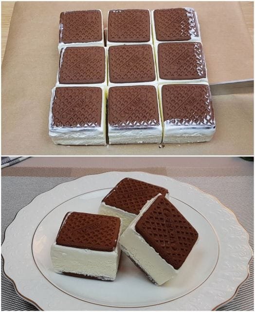 Once the ice cream is fully frozen, remove it from the mold and cut it into portions.