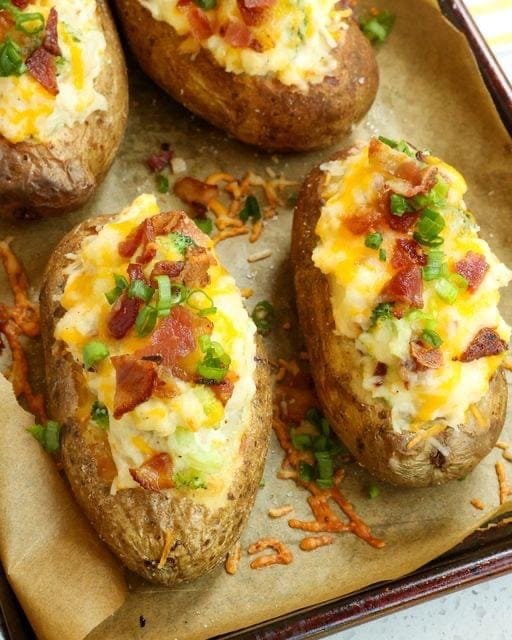 These crispy-skinned Loaded Baked Potatoes are packed with bacon, broccoli, and sour cream, all topped with a generous portion of cheddar cheese and Monterey Jack Cheese and sprinkled with thin slices of green onions. I love to serve these tasty spuds with grilled pork, roasted chicken, or barbecued ribs