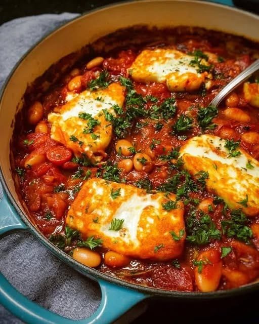 “A wholesome, one-pan dish with creamy white beans, spiced tomato sauce, and golden halloumi — perfect with warm pita, couscous, or bulgur wheat.”