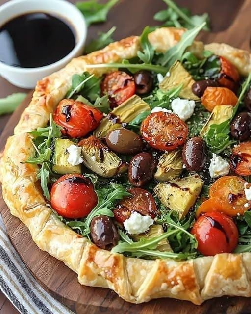 This Mediterranean Veggie Tart is a light, flaky, and flavorful dish that combines the richness of buttery puff pastry with vibrant Mediterranean toppings. Juicy cherry tomatoes, marinated artichokes, briny Kalamata olives, and creamy goat cheese come together to create a savory and refreshing tart. Finished with fresh arugula and balsamic glaze, this dish makes a perfect appetizer, brunch, or light lunch.