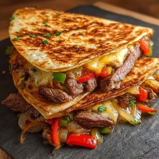 Sizzling, seasoned steak strips with sweet caramelized bell peppers and onions, loaded with melty cheese, all wrapped in golden-crisp tortillas. These quesadillas are perfect for a hearty lunch, quick dinner, or game-day snack!