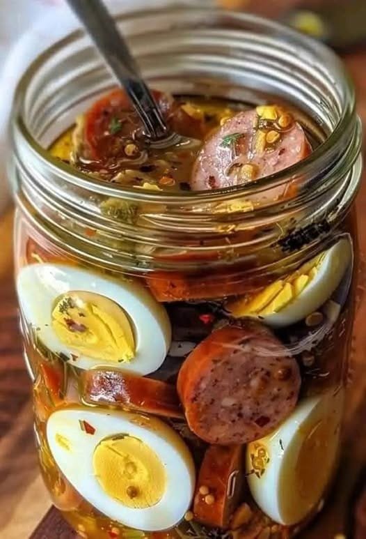 Carefully pour the hot vinegar mixture over the eggs, sausage, and onions, ensuring everything is fully submerged.
