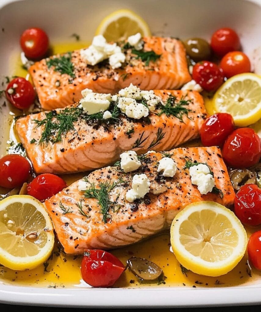 This Quick and Easy Greek Salmon is a flavorful, healthy dish featuring tender, flaky salmon fillets marinated in classic Mediterranean ingredients. The salmon is seasoned with garlic, lemon juice, olive oil, oregano, and fresh herbs, then baked or pan-seared until perfectly cooked. Topped with cherry tomatoes, Kalamata olives, red onions, and crumbled feta, this dish offers a delicious balance of savory, tangy, and fresh flavors. It makes for a nutritious, protein-packed meal that’s ready in under 30 minutes, perfect for a busy weeknight dinner.