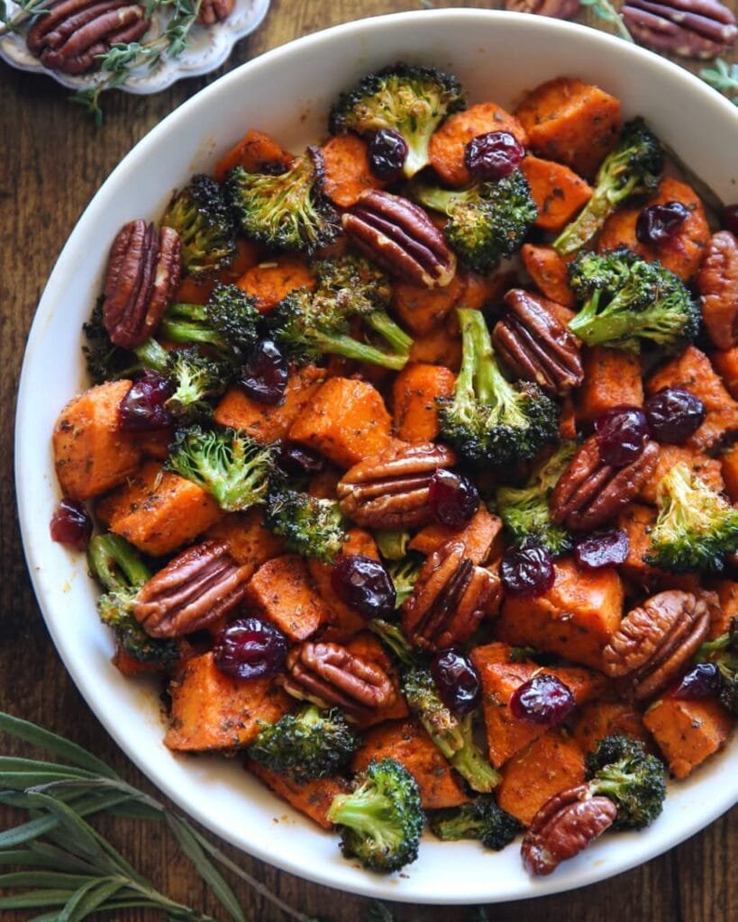Roasted Sweet Potatoes and Broccoli with Cranberries and Pecans