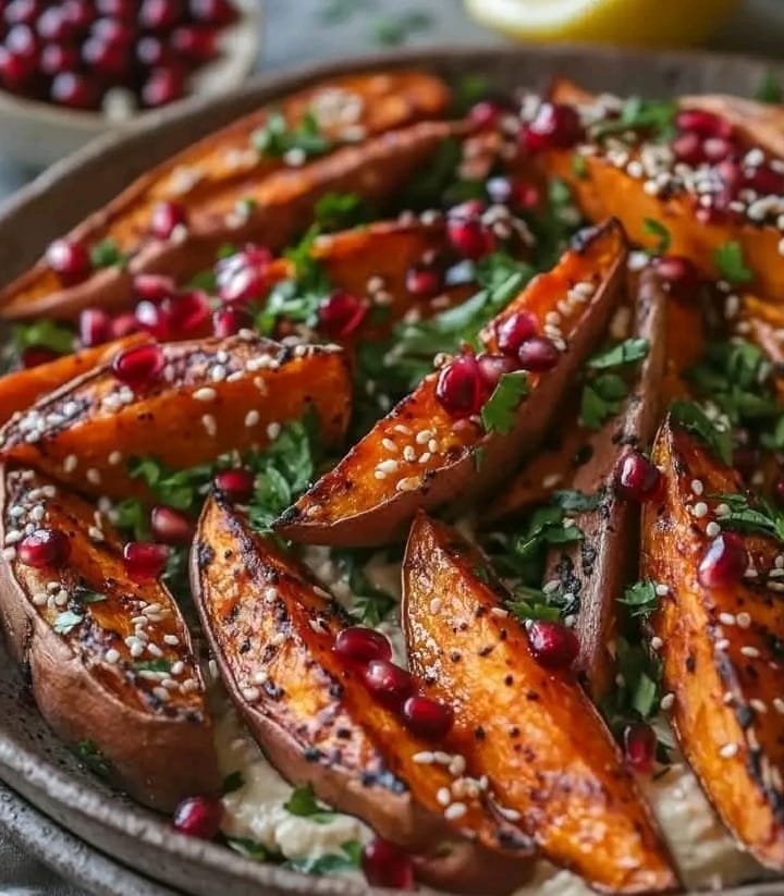 Golden sweet potato wedges paired with creamy tahini and a burst of pomegranate for a stunning, flavor-packed dish.
