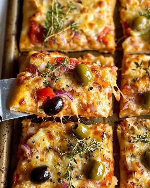 This rustic sheet pan veggie pizza delivers a perfect combination of flavors and textures: a crispy, golden crust, a tangy tomato base, gooey melted mozzarella, and a medley of vibrant vegetables. Briny olives, sweet peppers, and fresh herbs make every bite bold and satisfying. Whether you’re making it for a family dinner, casual get-together, or weekend treat, this pizza is a delicious homemade alternative to takeout.