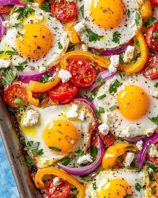 This vibrant and healthy breakfast dish features sunny-side-up eggs baked on a single sheet pan with a medley of colorful vegetables—juicy cherry tomatoes, sweet bell peppers, and zesty red onions—all roasted to perfection. Crumbled feta adds a creamy tang, and a sprinkle of herbs finishes it off with freshness. Quick to prepare, easy to clean up, and bursting with flavor, it’s perfect for busy mornings or relaxed weekend brunches.